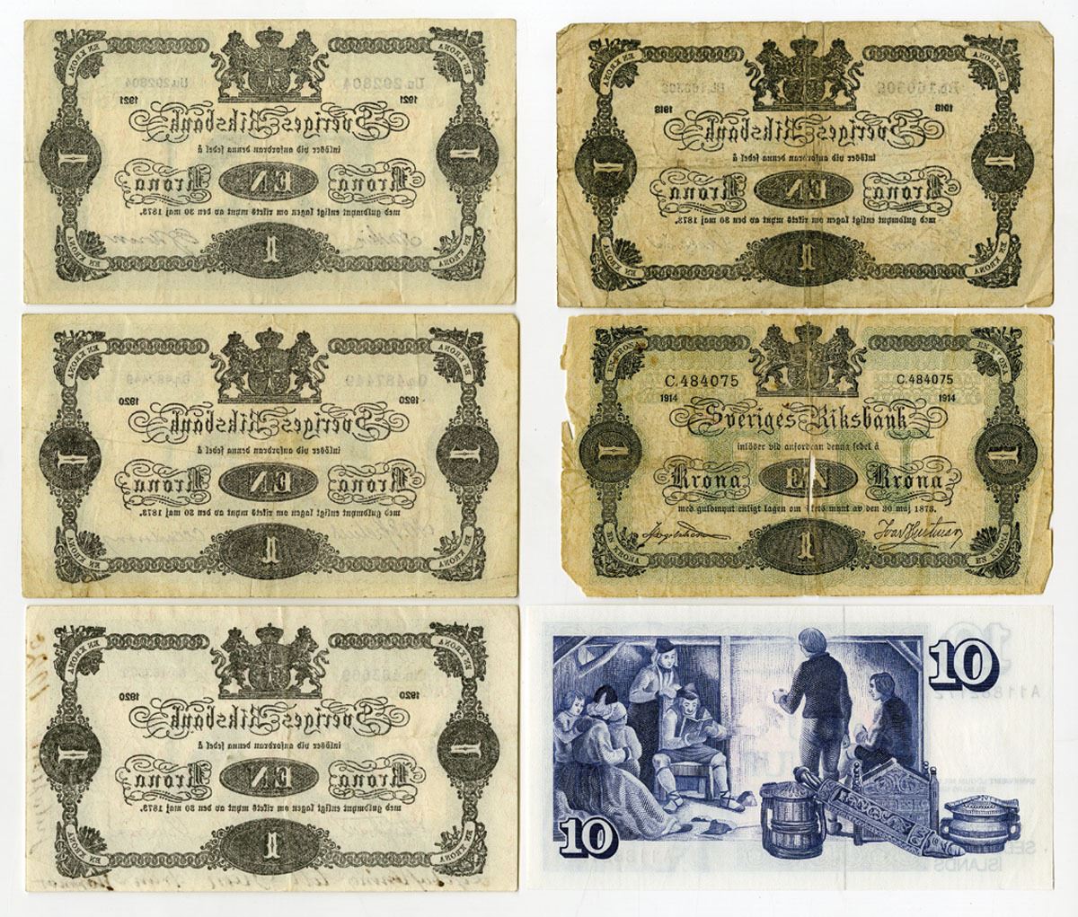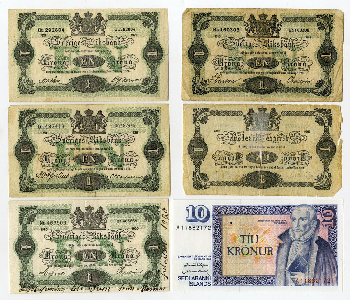 Sweden & Iceland, 1921-61. Lot of 6 Issued Banknotes, Includes: Bank of Sweden 1 Korona, P-32h (5), 1921; Central Bank of Iceland 10 Kronur, P-48a, L.1961 (1981). Notes range from Fine to XF condition. (6).