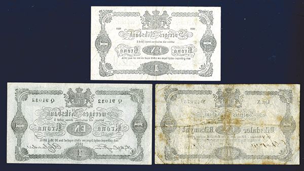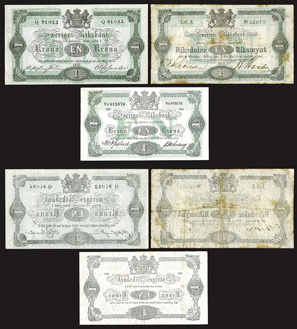 Sweden, lot of 3 issued notes, includes 1 Riksdaler, 1869, P-A139a, Fine; 1 Krona, 1875, P-1b, XF; 1 Krona, 1921, P-32h, XF. Scarce classic group.