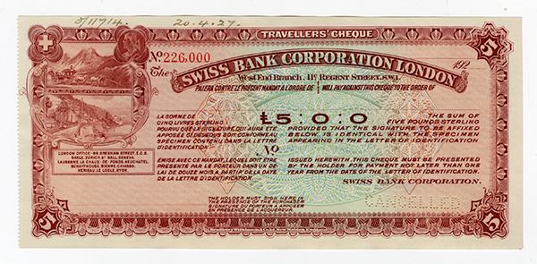 England and Switzerland. 5 Pounds Specimen Traveler's Cheque, Purple on light green, back blank, Pin-punch specimen overprint, Archival notation on top left margin with date 20-4-(19)27, AU to Unc. BW&C.