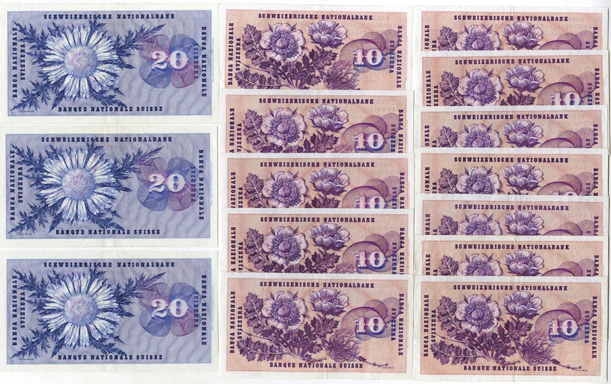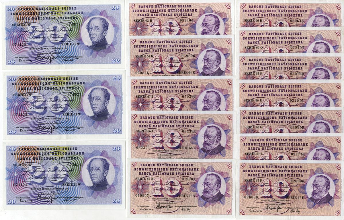 Switzerland, 1959 to 1974. Lot of 15 Issued banknotes, including: 10 Franken, P-45p (10), P-45s (1), and P-45t (1), notes range from VF to AU; and 3 Sequential, 20 Franken, P-46g (3), all 3 in Choice AU condition. Printer: OFZ. (15)