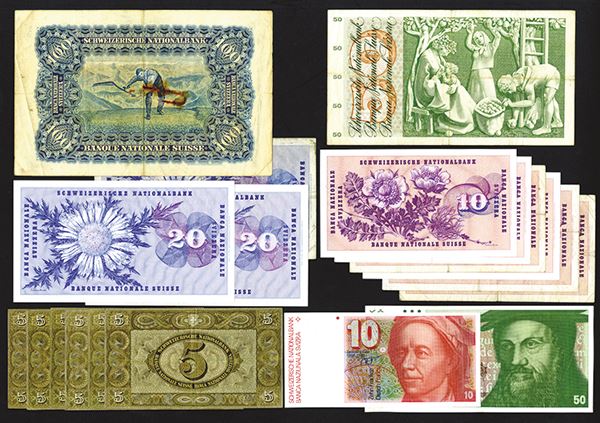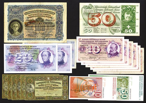 Switzerland. 100 Francs, P-35g (paper clip ruse and hole); 5 Francs, 1949. P-11m; 11n (4); 11o; 10 Francs, P-45 (6); 20 Francs, 46 (3); 50 Francs, P-48; 10, 50 Francs; P-53; 56. 19 pieces.