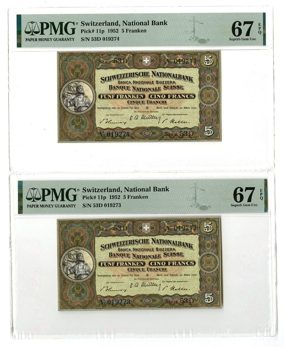 Switzerland, Lot of 2 notes, both are 1952. 5 Franken, P-11p (2), Issued Sequential Pair of Banknotes, Black and green on m/c underprint with Hercules at left, Back is brown with numeral at center, S/Ns 53D 019273 and 53D 019274, Both notes are PMG graded Superb Gem Uncirculated 67 EPQ. (2). Sold "AS IS" no returns accepted.