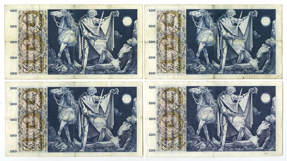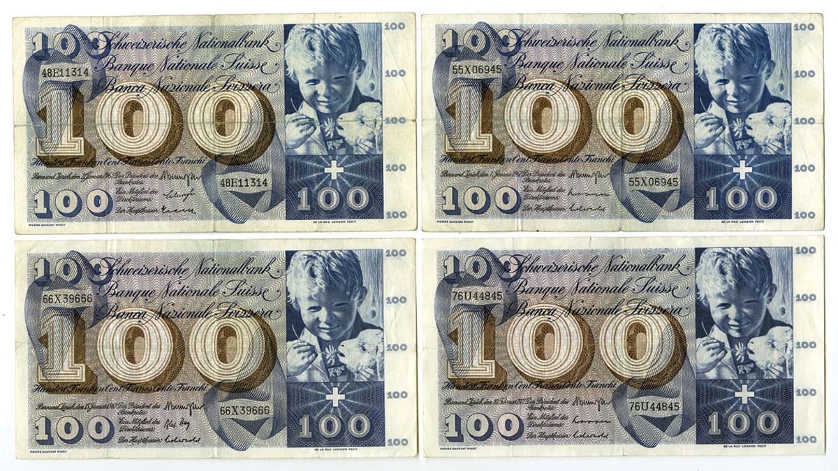 Switzerland, Lot of 4 notes, Includes 1965-71. 100 Franken, 1965, P-49g; 1967, P-49i; 1969, P-49k; and, 1971, P-49m, Dark blue and brown-olive on m/c underprint with boy's head at right with lamb, Back is blue and brown with St. Martin cutting his cape, Notes are in VF to Choice VF condition. (4). Sold "AS IS" no returns accepted.
