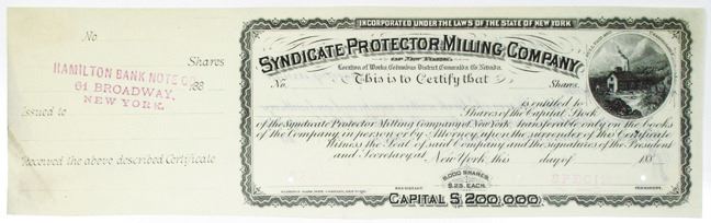 Location of Mining Works, Columbus District, Esmeralda County, Nevada, (Inc. in New York), 1880s. Odd Shares Specimen Capital Stock Certificate, Black text with black border, Cabin in woods at top right corner. Pink specimen overprints ands POCs. Fine-VF condition, Hamilton BN.