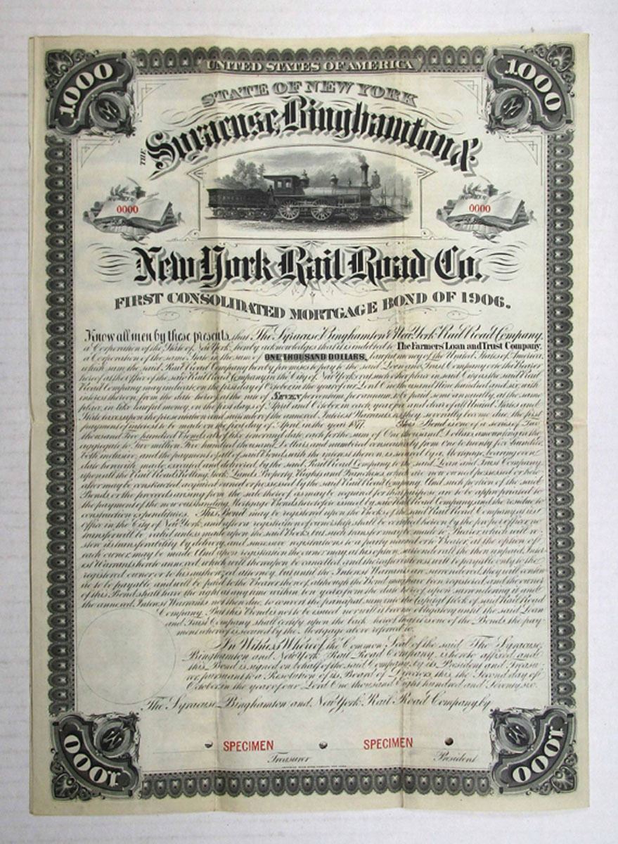 New York, 1876. $1000 Specimen 7% First Consolidated Mortgage Coupon Bond, Black printing with black border and locomotive in profile at top, Specimen overprints and POCs, VF to XF condition, ABNC. This is the only example found in the ABN Archives in 2002.