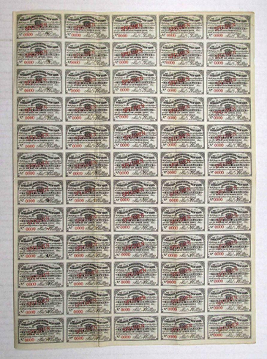 New York, 1876. $1000 Specimen 7% First Consolidated Mortgage Coupon Bond, Black printing with black border and locomotive in profile at top, Specimen overprints and POCs, VF to XF condition, ABNC. This is the only example found in the ABN Archives in 2002.