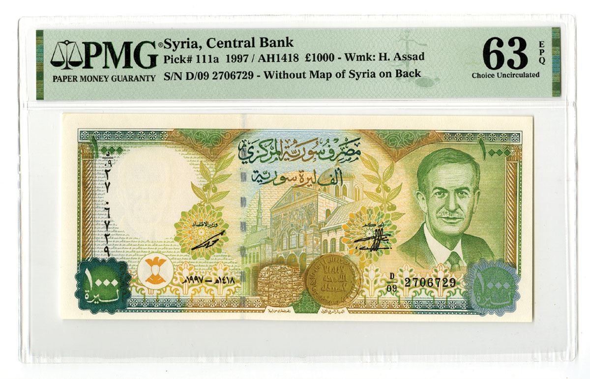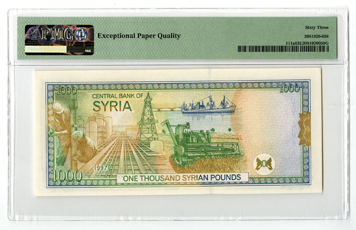 Syria, 1997/AH1418. 1000 Pounds, P-111a, Issued Banknote, Green with blue and light brown on m/c underprint, Portrait of H. Assad at right and Omayyad Mosque with Dinar coin at center, Back is green and m/c with oil industry workers at left, harvesting machinery and fishing boat, S/N D/09 2706729, PMG graded Choice Uncirculated 63 EPQ.