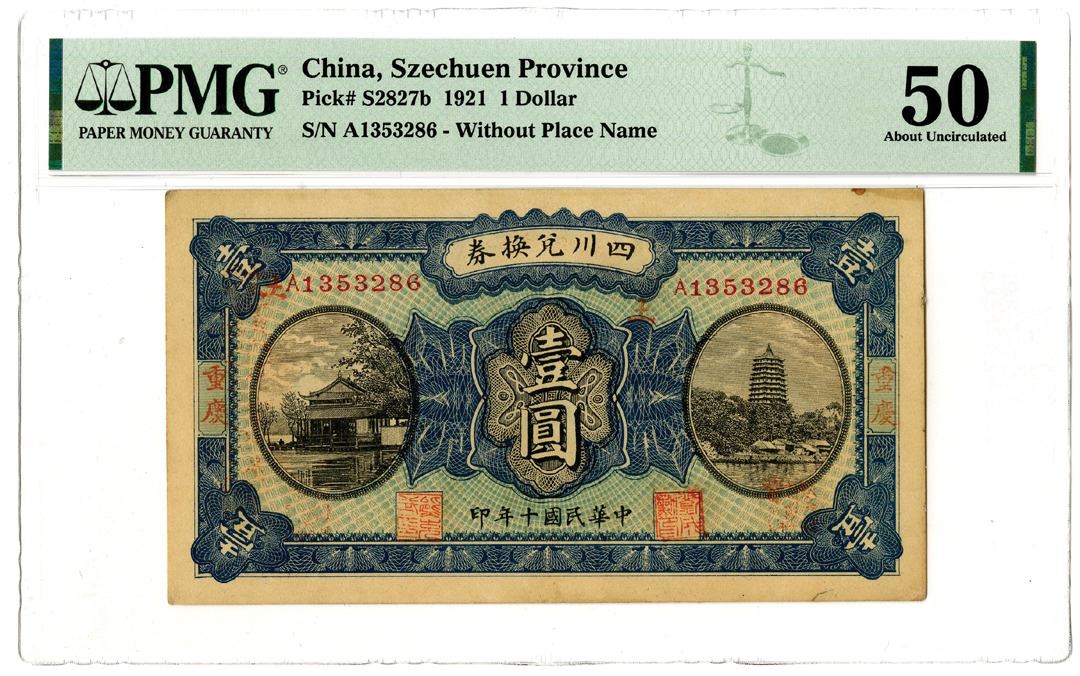 China. 1921. 1 Dollar, P-S2827b, Issued banknote, Dark blue on light blue undertint, S/N A1353286 - Without Place Name, PMG graded About Uncirculated 50 with comment "Tear Repair". This is one of the highest graded examples offered at auction.