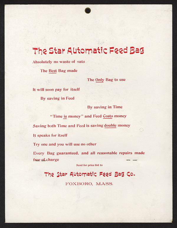 Massachusetts. Foxboro. Wonderful horse head and feed bag. Back with a nice advertisement.