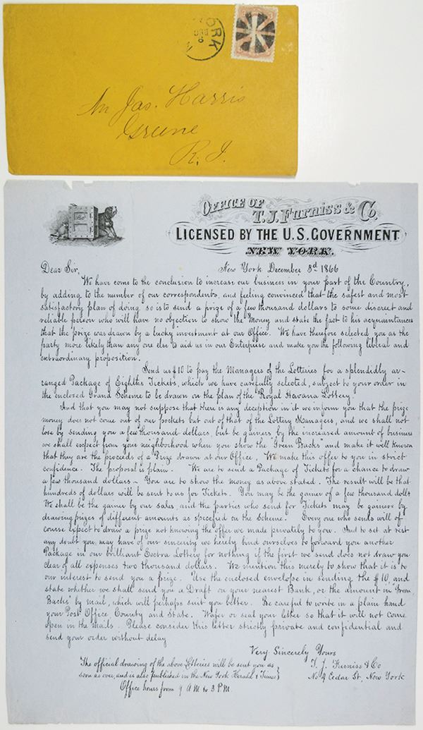 New York, 1866. Lot of 2 pieces, T.J. Furniss & Co. Letter about the Royal Havana Lottery of 1866, Letter discussing lottery. (2) (From the John E. Herzog Collection)