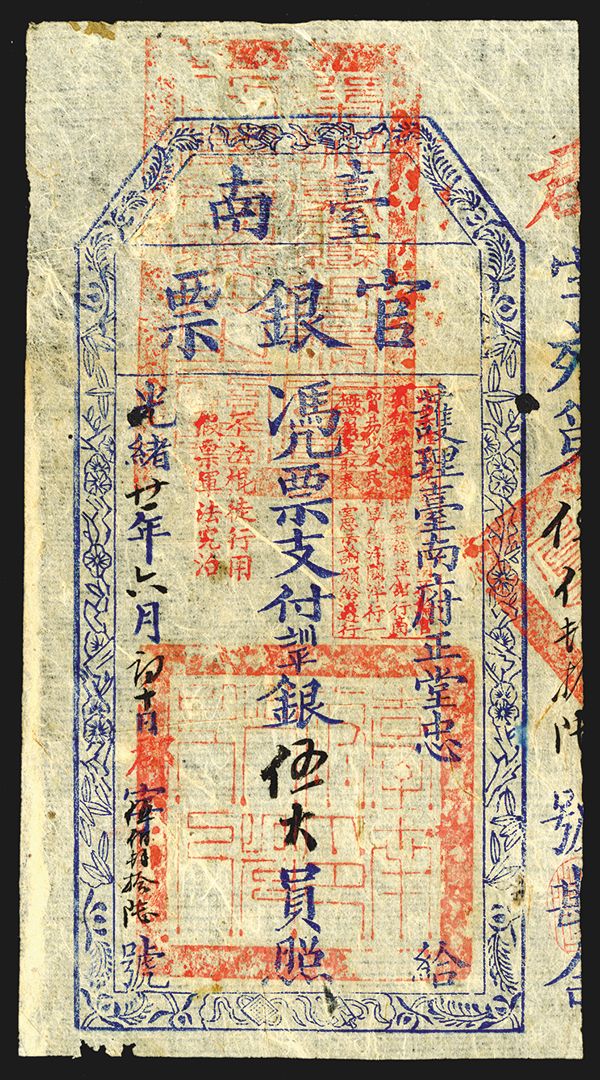 China Taiwan. Year 21, 1895. 5 Dollars. P-1905b. Thin paper variety. Denomination hand written. Holed. Nice Very Fine.