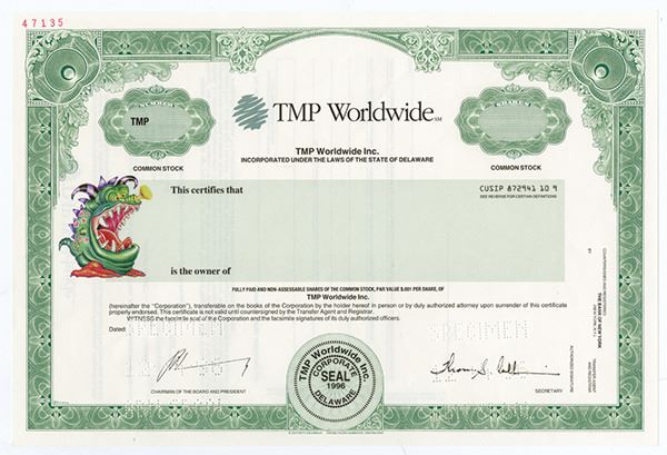 Delaware. Odd Shares, Specimen Common stock, Black on green border with Monster vignette on left side, Pin-punch Specimen Overprint, uncirculated. SC-USBN. TMP Worldwide is the world's largest recruitment advertising agency, a top 10 Web publisher, and the world's 14th largest advertising agency overall. TMP Worldwide Inc. is the world's largest Yellow Pages advertising agency as well as a leader in the field of recruitment advertising. Its offerings include monster.com, a web site that in 1999 was carrying more than 140,000 job advertisements and contained a database of more than a million resumes. Both Yellow Pages and recruitment clients place small advertisements that are distributed to thousands of media outlets. TMP Worldwide's astonishing growth in the 1990s was fueled by the acquisition of more than 100 companies, including 45 between the beginning of 1996 and the end of 1998.