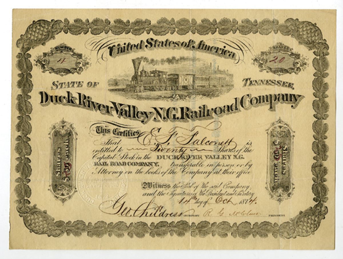 Tennessee, 1874. 20 Shares I/U Capital Stock Certificate, Black print with black ornate border and coal powered train at top center, S/N 4, VF to XF condition. The Duck River Valley Narrow Gauge Railroad Company was incorporated in Tennessee in the 1870s to build and operate a short line serving communities along the Duck River. Part of the nationwide narrow-gauge railroad movement, it aimed to provide affordable regional transport for agricultural and timber products. Chartered during the post-Civil War reconstruction era, the line represented local economic optimism and development. The 1874 certificate, featuring an early locomotive vignette, is an attractive relic of southern railroad expansion. It is a listed railroad in Cox, but no images of an issued certificate have been seen. Extremely rare and first time we have offered an example of this company.