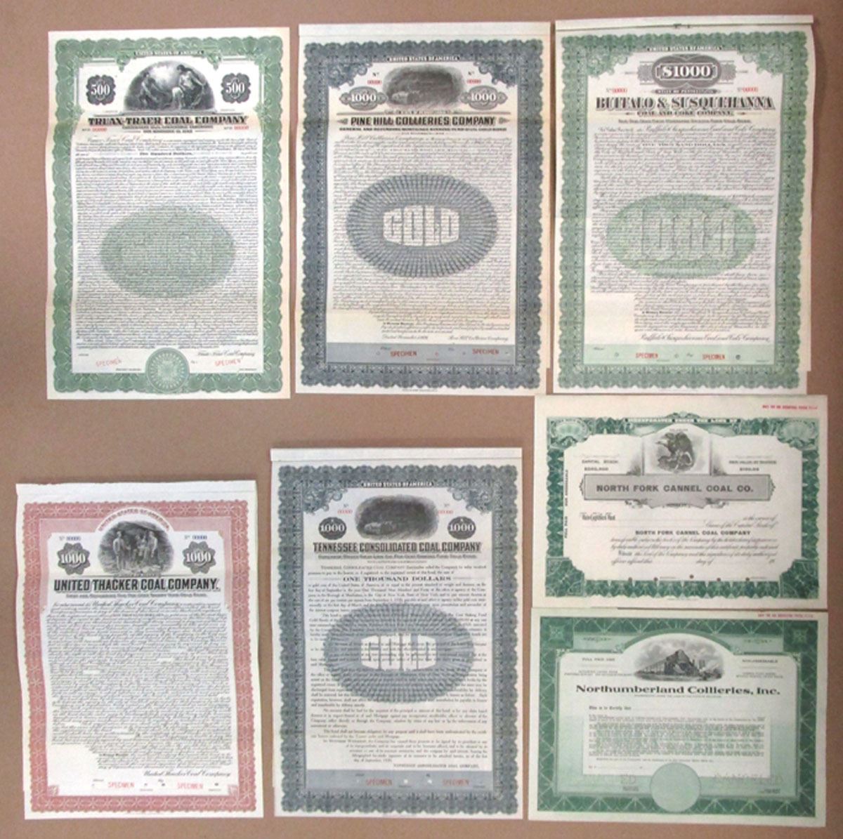 Delaware, Tennessee, Maine, and Pennsylvania, 1914-26. Lot of 7 Specimen Certificates: North Fork Cannel Coal Co. Stock Cert; Northumberland Collieries, Inc. Stock Cert; Truax-Traer Coal Co. Bond; Pine Hill Collieries Co. Bond; Buffalo & Susquehanna Coal and Coke Co. Bond; United Thacker Coal Co. Bond; Tennessee Consolidated Coal Co. Bond. Stock are all POCs and Bonds all have Specimen overprints and POCs. Bonds range from Fine to VF condition. (7). Sold "AS IS" no returns accepted.