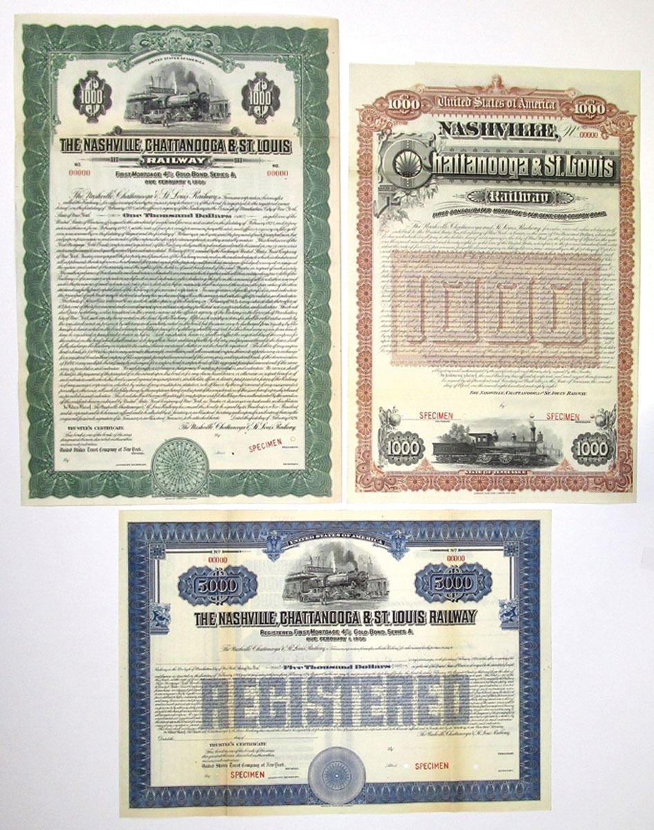Tennessee. Lot of 3 Specimens, Includes an 1888, $1000 Specimen 5% First Consolidated Mortgage Gold Coupon Bond with brown border; 1928, $1000 Specimen 4% First Mortgage Gold coupon Bond with green border; and, a 1928. $5000 Specimen 4% Registered First Mortgage Gold Bond with blue border. All are in VF condition. The blue bond is an unlisted in this color in Cox, all are only known as specimens.