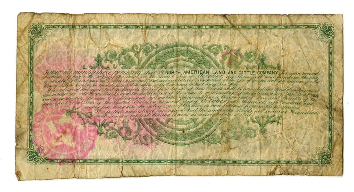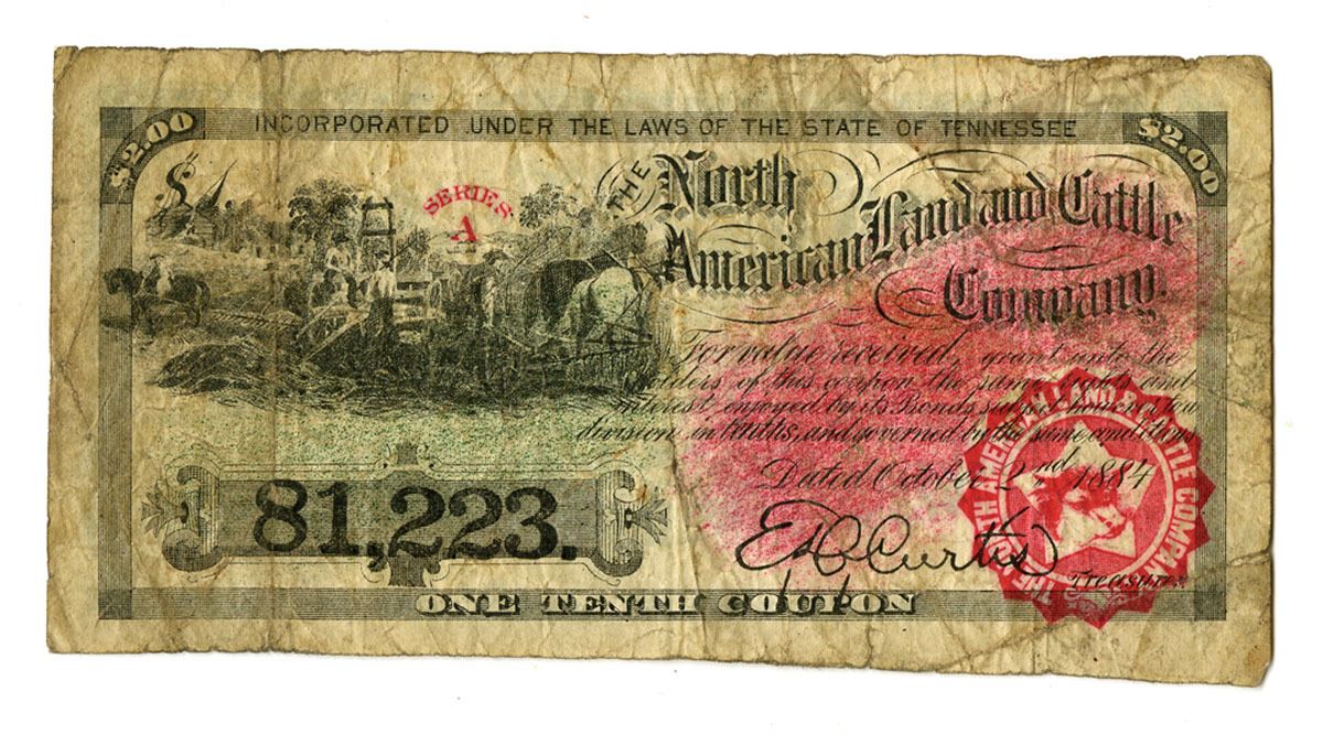 Tennessee, 1884, North American Land and Cattle Company, $2.00 lottery ticket (Series A), No. 81,223; printed in black and red with an ornate border, large denomination counters, and a vivid red overprint seal featuring a steer’s head; left vignette shows farm and ranch scenes with horses, wagons, and early agricultural activity, reflecting the firm’s late-19th-century effort to raise funds for large-scale ranching through public lotteries and subscriptions; The back has very small text printed in green listing the conditions for the lottery, incorporated under Tennessee law during the peak cattle-boom years, when promoters consolidated land holdings and herds and marketed securities nationwide; hand-signed by the treasurer and dated October 1, 1884; VG with evidence of considerable handling.