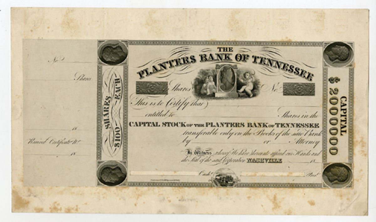 Nashville, Tennessee, ND (1830-40s). Capital Stock Proof Certificate, Black printing with Cherubs flanking bust of soldier and busts in each of the corners, Printed on India paper and mounted on cardstock, Signature blocks cut out. XF to AU condition with light foxing, UBS&H.