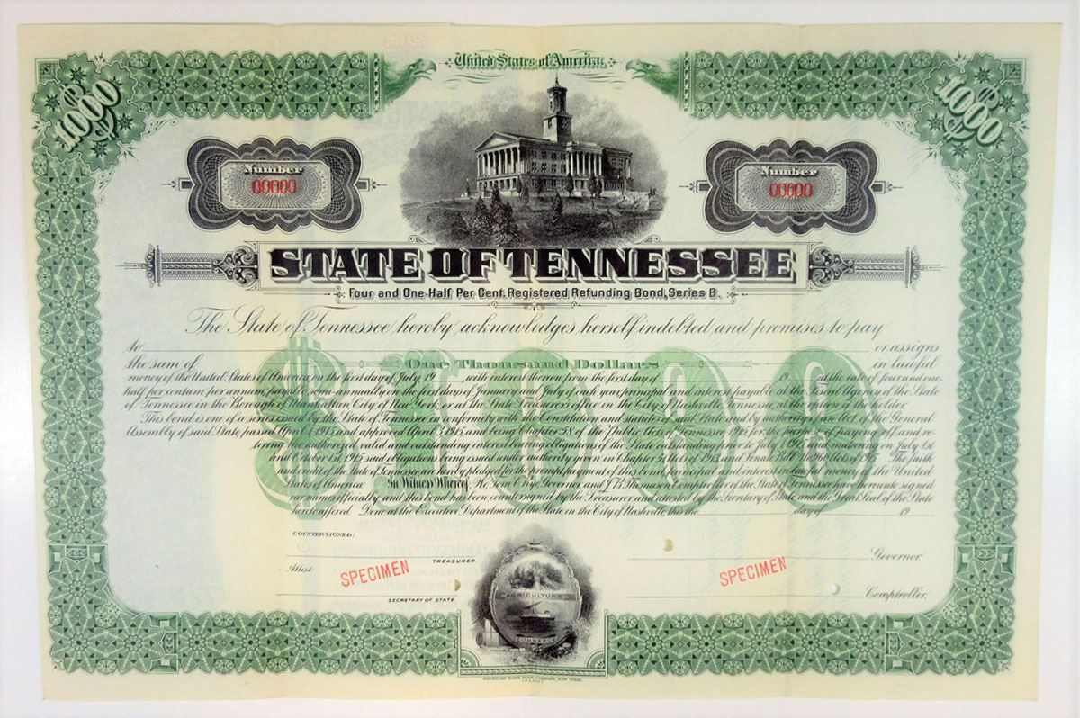 Nashville, Tennessee. $1,000 Specimen 4 1/2% Registered Series B Refunding Bond, Large building at top, Black print on green border and under tint, Specimen overprints and POC's, VF-XF condition, ABNC.