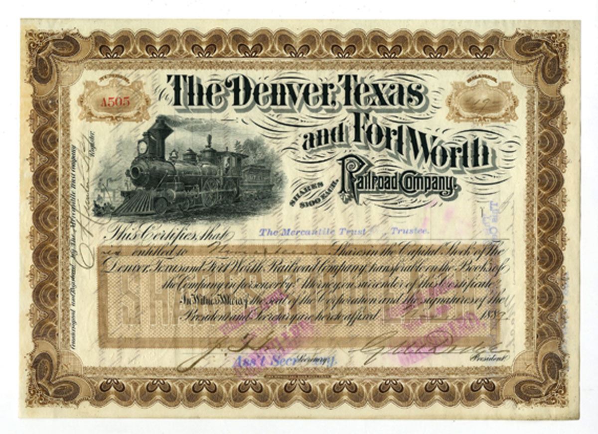 Texas, 1889. Denver, Texas & Fort Worth Railroad Co., 19 Shares Capital Stock I/C Certificate, Black print with brown border and underprint, Locomotive at left side, Cancelled overprints along bottom, VF condition with stains. An attractive and historic certificate, signed by General Grenville M. Dodge as president. Dodge, one of America’s most prominent railroad engineers and Civil War generals, he played a central role in the construction of the Union Pacific Railroad, serving as its Chief Engineer during the building of the first Transcontinental Railroad. His postwar career linked him to several key Western lines, including the Denver, Texas & Fort Worth Railroad, part of the expansion that connected Denver to North Texas and the Gulf. Certificates bearing his authentic signature are highly sought after for their dual significance in railroad and American military history. Dodge’s bold signature remaining clear and legible. HLBNC.