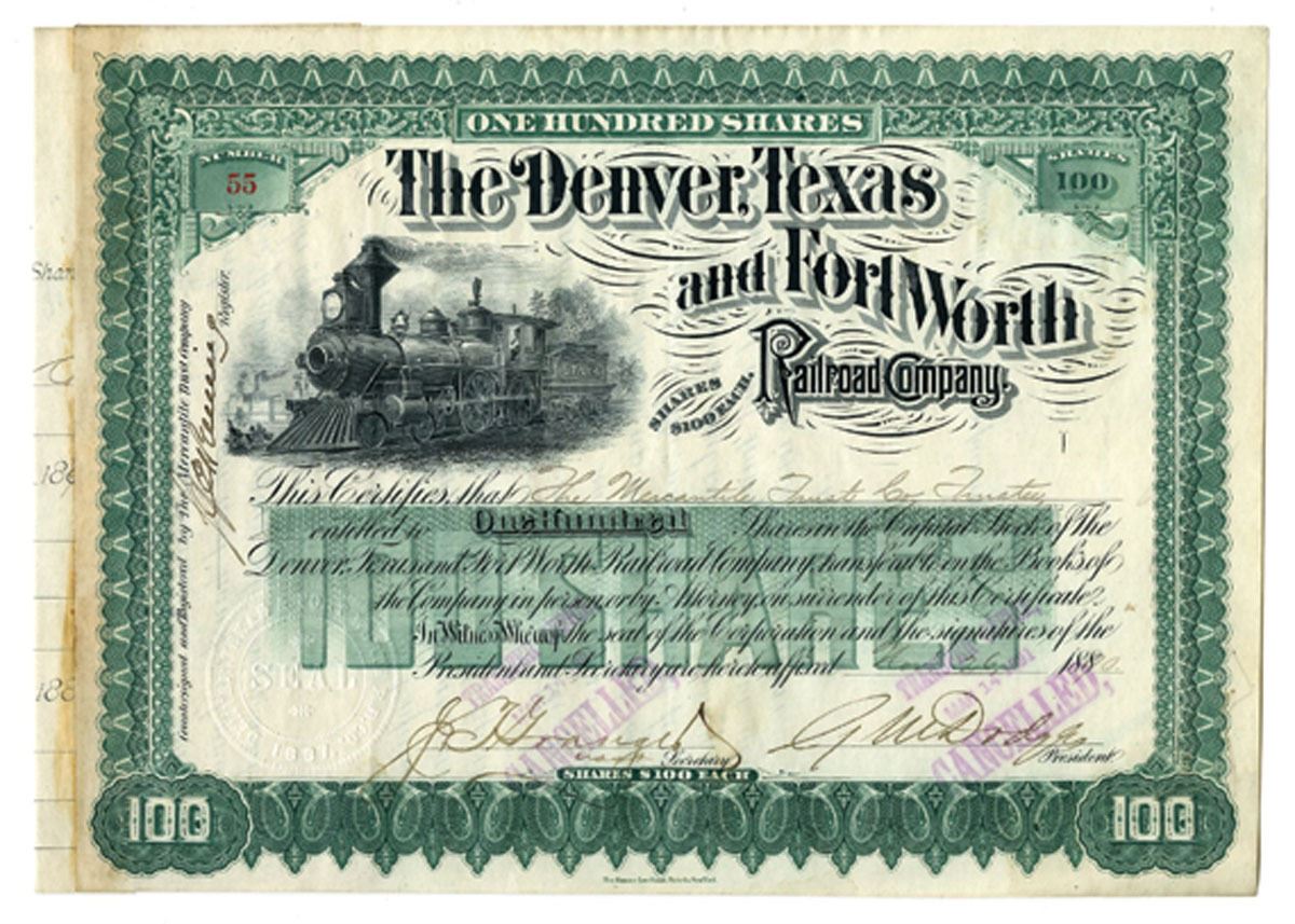 Texas...., 1890. 100 Shares Capital Stock I/C Certificate, Black print with green border and underprint, Locomotive at top left of title, S/N 55, Cancelled overprints along bottom, VF condition with stains. HLBNC. Signed by General Grenville M. Dodge as president. Dodge, one of America’s most prominent railroad engineers and Civil War generals, he played a central role in the construction of the Union Pacific Railroad, serving as its Chief Engineer during the building of the first Transcontinental Railroad. His postwar career linked him to several key Western lines.