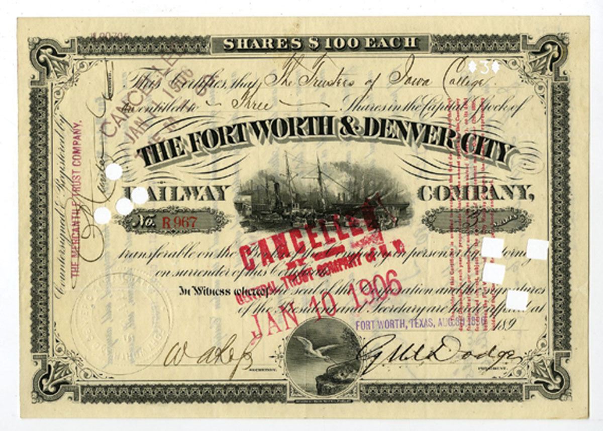 Texas, 1896. 3 Shares Capital Stock I/C Certificate, Black print with ship yard vignette at center, POCs and stamped out cancelled at center, S/N R967, VF to XF condition, ABNC. Dodge, one of America’s most prominent railroad engineers and Civil War generals, played a central role in the construction of the Union Pacific Railroad, serving as its Chief Engineer during the building of the first Transcontinental Railroad.
