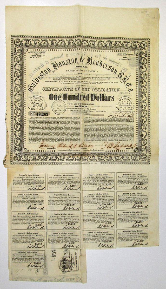 Galveston, Texas, 1857. $100 or 20 Pounds Sterling, Issued and Uncancelled 8% Coupon Bond. Black print with ornate black scroll work. Attached is an I/U $40 Share certificate. Very Fine.