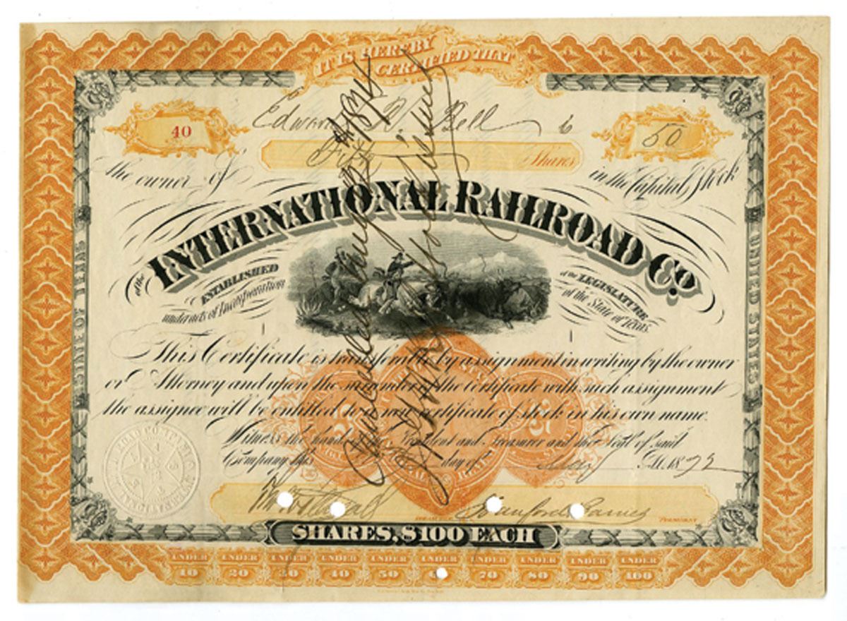 Texas, 1872. 50 Shares I/C Capital Stock Certificate, Black print with orange border and underprint, Cowboys herding cattle at center under company title, 25 cent, Imprinted Revenue RN-U1 at center, S/N 40, POCs along bottom and hand written cancelled across face, Choice VF condition. CBNC. Printed Revenue RN-U1 handstamp at upper center; signed by Sanford Barnes as president. The International Railroad Company was chartered in 1870 to construct a line from Hearne to the Red River, connecting with the Houston & Texas Central Railroad and ultimately forming part of the International & Great Northern Railroad system. Sanford Barnes served as an early executive and guiding figure in the road’s formative years before its consolidation in 1873. A historic Texas railroad stock from the early post-Civil War expansion era. The condition ranges from Choice Fine to VF condition or better. Printed by Henry Seibert & Bros., New York.