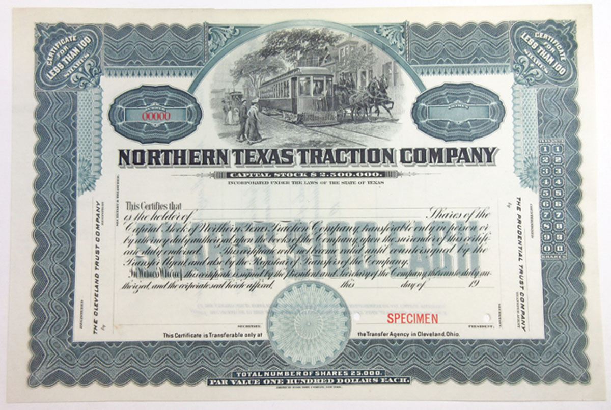 Texas. <100 Shares Specimen Capital Stock Certificate, Black print on blue border and under tint, Street car beside horse and buggy at top, Specimen overprints and POC's, VF-XF condition, ABNC. Only known as a specimen in Cox. Rare.
