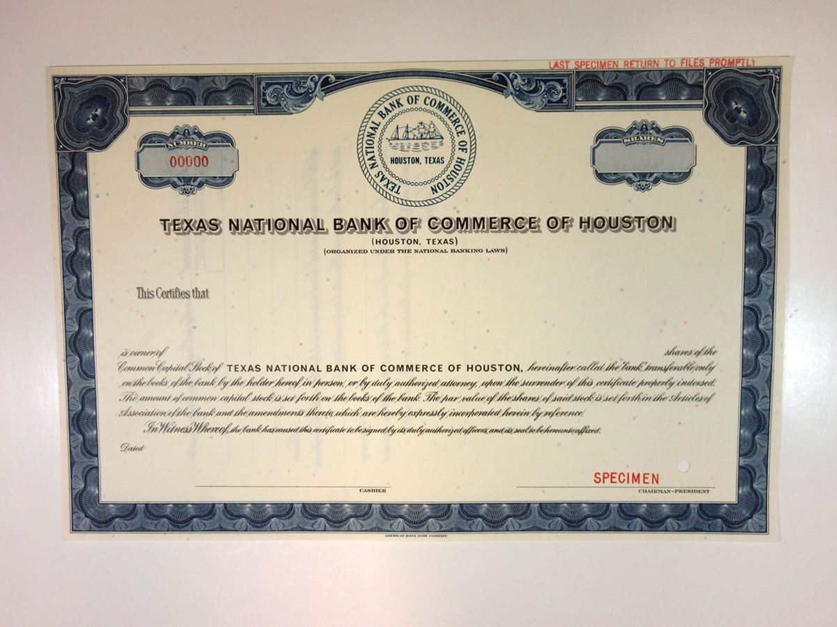 Houston, Texas. Texas National Bank of Commerce of Houston 1930-60 Specimen Stock Certificate Unc ABN