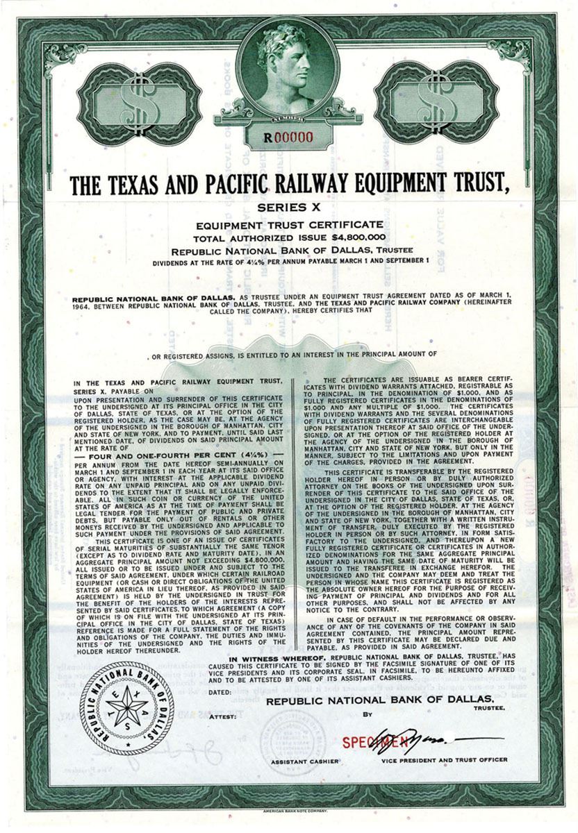 The Texas and Pacific Railway Company was created by federal charter in 1871 with the purpose of building a southern transcontinental railroad between Marshall, Texas, and San Diego, California. Printed by ABNC.