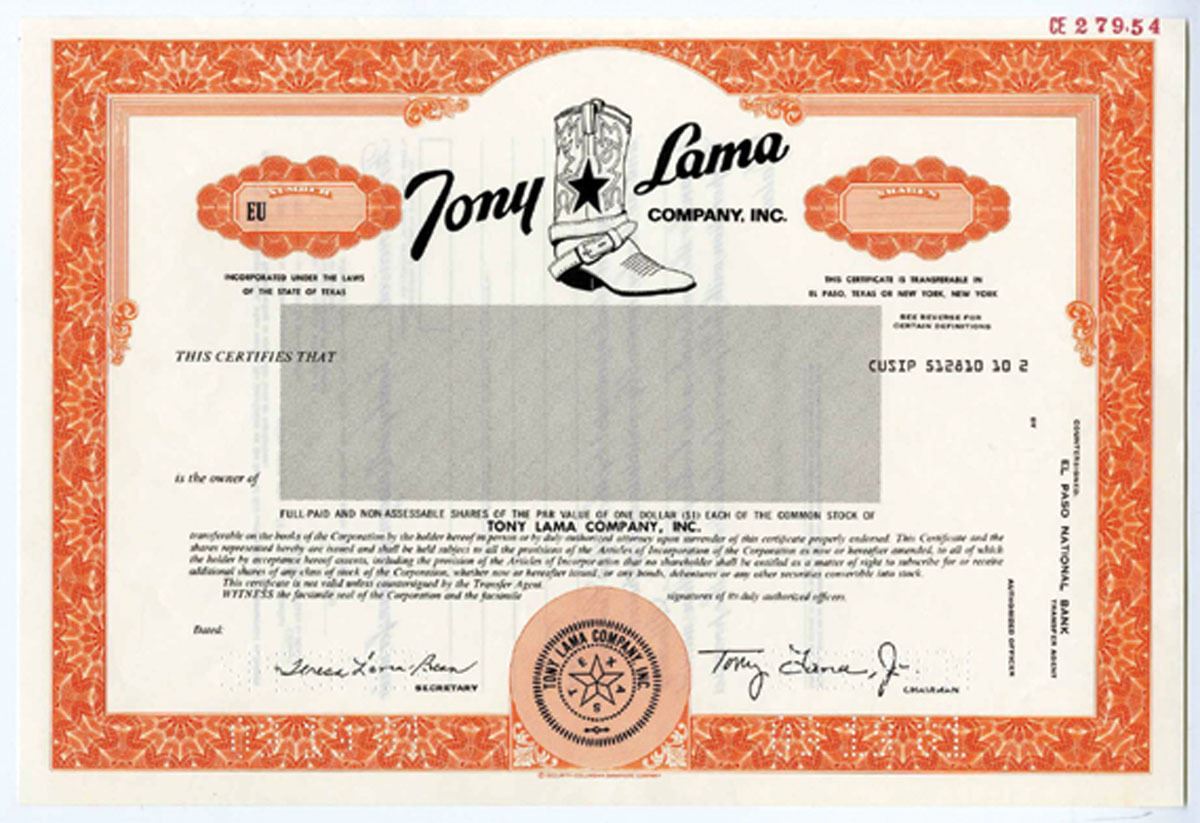 TX. Tony Lama Co. Inc., 1981 Odd Shrs Specimen Stock Cert., Unc. SCBN Orange. Boot Maker of well known stylish boots.