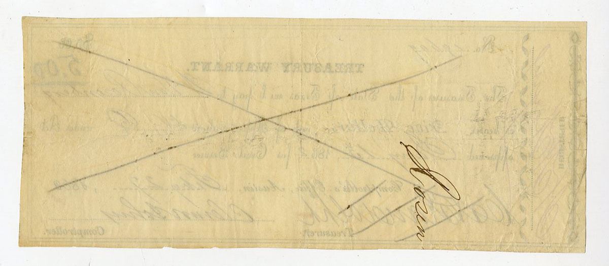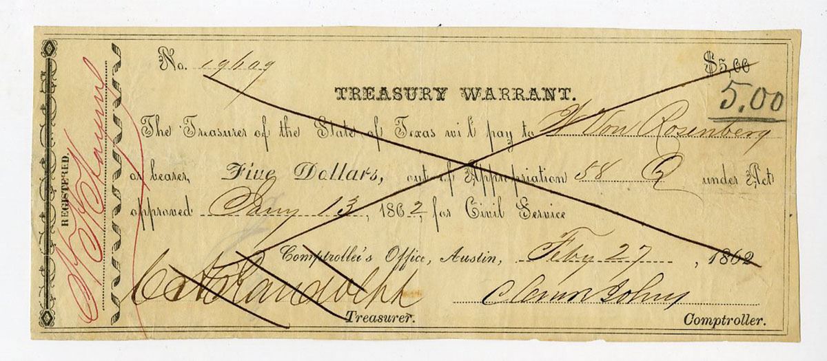 Austin, Texas. Treasurer of the State of Texas, 1862. $5 I/C Warrant, VF. Payable for Civil Service, black on off white paper, "X" ink cancelled, S/N 19609, back blank, VF condition.