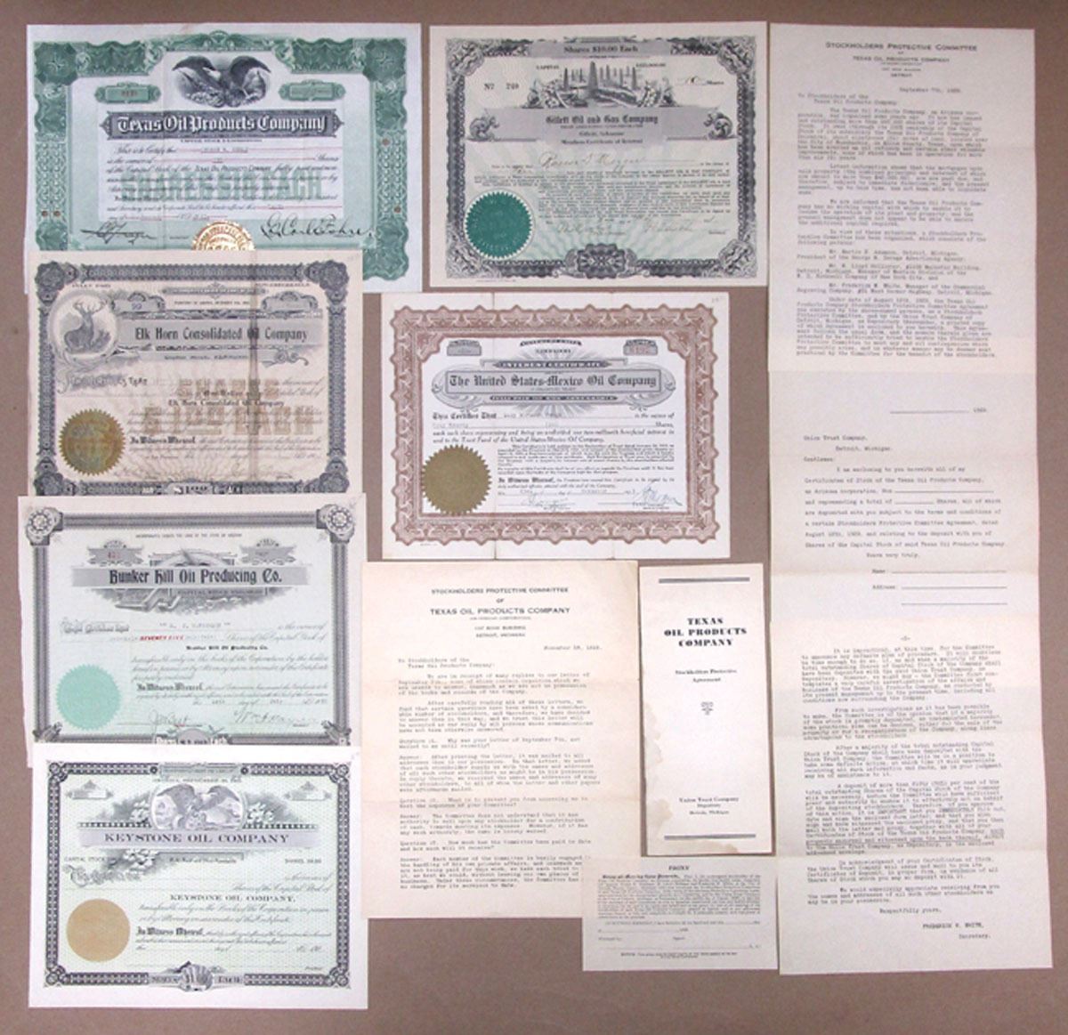 Various States, 1902 to 1923. Lot of 10+ Items including Stock Certificates and Shareholder Letters: Elk Horn Oil Co., Bunker Hill Oil Producing Co., Keystone Oil Co., Texas Oil Products Co., United States-Mexico Oil Co., and Gillet Oil and Gas Co., Lot also includes Texas Oil Products Co. Stockholder Protective Agreement and letters. Certificates range from VF to XF condition. (10+). Sold "AS IS" no returns accepted.