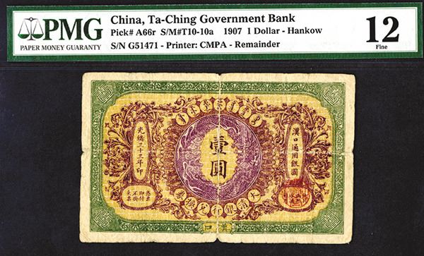 China, $1, p-A66r (S/M#T10-10a), Remainder banknote, green on lilac and light brown, back blue and tan with supported arms at center, PMG graded Fine 12, Attractive and rare note, Printer: CMPA.