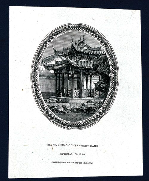 Proof vignette of Tea House used on the $10, 1909, P-A78 and Bank of China Issue, $10, P-27, Banknote. This portrait was used on the face of the note. Printed in black on india paper, 2.8 x 3.5 inches, with ornate oval border, imprint on bottom states “The Ta-Ch’ing Government Bank - Special - C- 1135 - American Bank Note. Co., N.Y.”, CU to Gem condition. Extremely rare production proof from ABN Archives. ABNC.