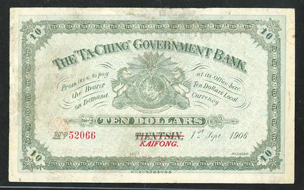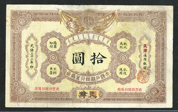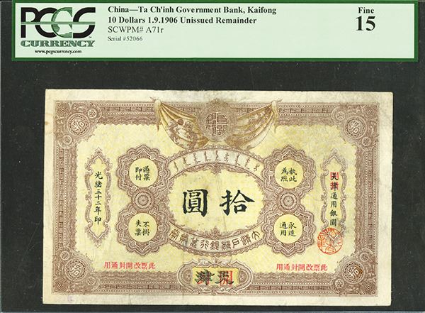 Kaifong, China. 1906, $10, P-A71r, (S/M#T10-3c), Remainder banknote, brown on light tan underprint, back olive gray with supported arms, PCGS graded Fine 15 but appears Choice Fine to VF. S/N 52066, Large even margins and bright colors only enhance the desirability of this note. This is the second highest out of 7 graded by PMG. A trophy for any Chinese collector.