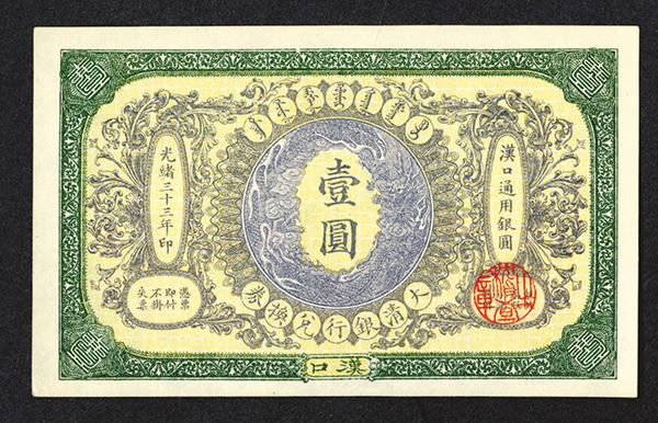 China, $1, P-A66, S/M#T10-10a, Issued banknote, face green and lilac on light yellow underprint, back Blue on light brown color with supported arms upper center, S/N F44275, Appears Choice to Gem Uncirculated but the lower right corner tip was slightly jammed in the past and almost impossible to view, so call it Uncirculated+, Scarce note in high grade and very attractive.