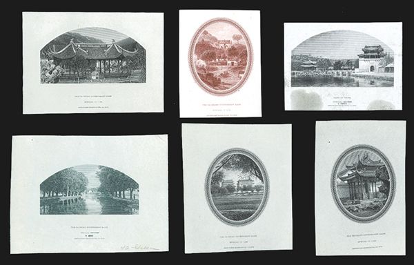 China, Lot of 6 different vignette proofs from the ABN "Ta-Ching Government Bank" series, All are printed on india paper that is not mounted, Includes the back central vignettes from the $1, P-A76 and $100, P-78B; Obverse proofs from the right side of the note include vignette of fortified city gates of the $50, P-A78A; $1, P-A76, hillside village and train; and the $10, P-A78, Teahouse; also included is a Bank of China proof vignette of buildings on water with bridge, unattributed. Extremely rare set of banknotes and just as rare as vignettes. Mostly choice Unc.