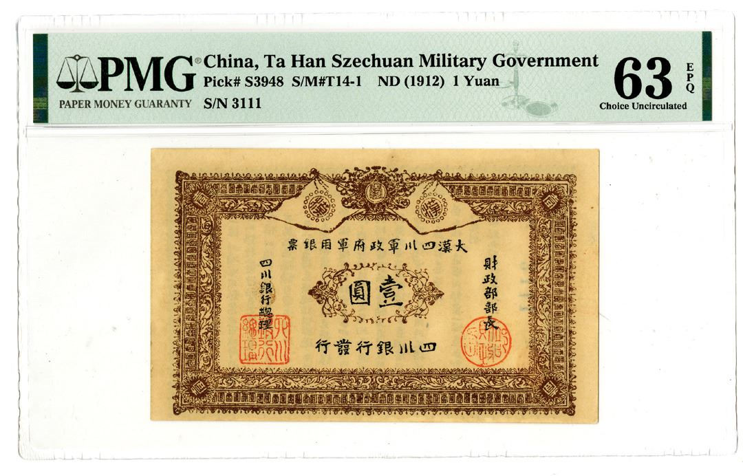 China. ND (1912). 1 Yuan, P-S3948 S/M#T14-1, Issued banknote, Brown on face, S/N 3111, PMG graded Choice Uncirculated 63 EPQ. Rare note that is rarely offered in auction in this high of condition.
