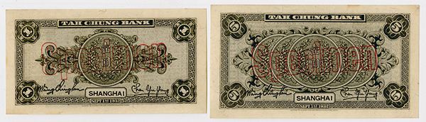 Shanghai, China. Lot of 2 notes, Both are 1932 Uniface back specimens, Includes 1 Yuan, P-561s, S/M#T12-30, Uncirculated, Dollar coin at center; and, 5 Yuan, P-562s, S/M#T12-31, Uncirculated, 5 Dollar coins at center, both with large red SPECIMEN overprints. Both are only known as specimens, no issued examples known, rare in any condition or format.