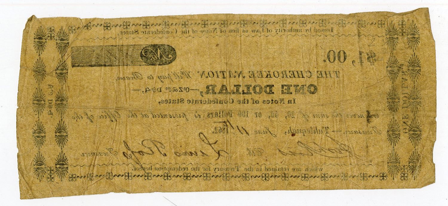 Tahlequah, Cherokee Nation (Oklahoma). June 11, 1862, Office of the Treasurer. $1, Cr. CHR N-2, Burgett-6, Durand IT-95, Issued obsolete scrip note, Dated June 11th, 1862, Black text with black border, Signed by Lewis Ross as Treasurer, Issued by authority of Law in lieu of Notes of the Confederate States, S/N 116, Choice Fine to VF condition. A desirable May 2, 1862 Act series that evolved from the Cherokee treaty with Brigadier Confederate General Albert Pike, against the advice of Paramount Chief John Ross. The notes were signed by two Ross family members: Lewis Ross, brother of Chief John Ross and uncle of Clerk Joshua Ross, who was a wealthy slaveholder. The notes did not circulate long and most were seized and destroyed in July 1862. Printed on very thin, translucent rag paper. Without imprint, but now attributed to John Candy in the Shull-Criswell reference. End panels at left and right, composed of linked oval ornaments, enclose the denomination ONE DOLLAR in English at the left and translated into the Sequoyah (named for the Cherokee innovator) alphabet at the right. The interesting use of both language styles helped prevent raising the notes' denominations. The additional obligation at the top, "Issued by authority of Law in lieu of Notes of the Confederate States," is continued along the bottom margin, "which are retained in the Treasury for the redemption hereof." Signed by Joshua Ross as clerk and Lewis Ross as treasurer. The foxed Ford XX note realized $8,625 in October 2007. The Burgett-Schingoethe note sold in July 2006 by Smythe had a rounded top left edge and realized a strong $10,350, a record price for the issue.