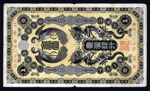 Taiwan, ND (ca. 1904-06), 1 Yen in Gold, P-1911, (S/M #70-10), Issued banknote, Black on yellow orange underprint, facing cockerels on top and facing dragons on middle, back purple. The note appears Choice Fine to VF condition with bright colors, firm paper, minimal handling evidence and claims to VF condition. Scarce note in high grade.