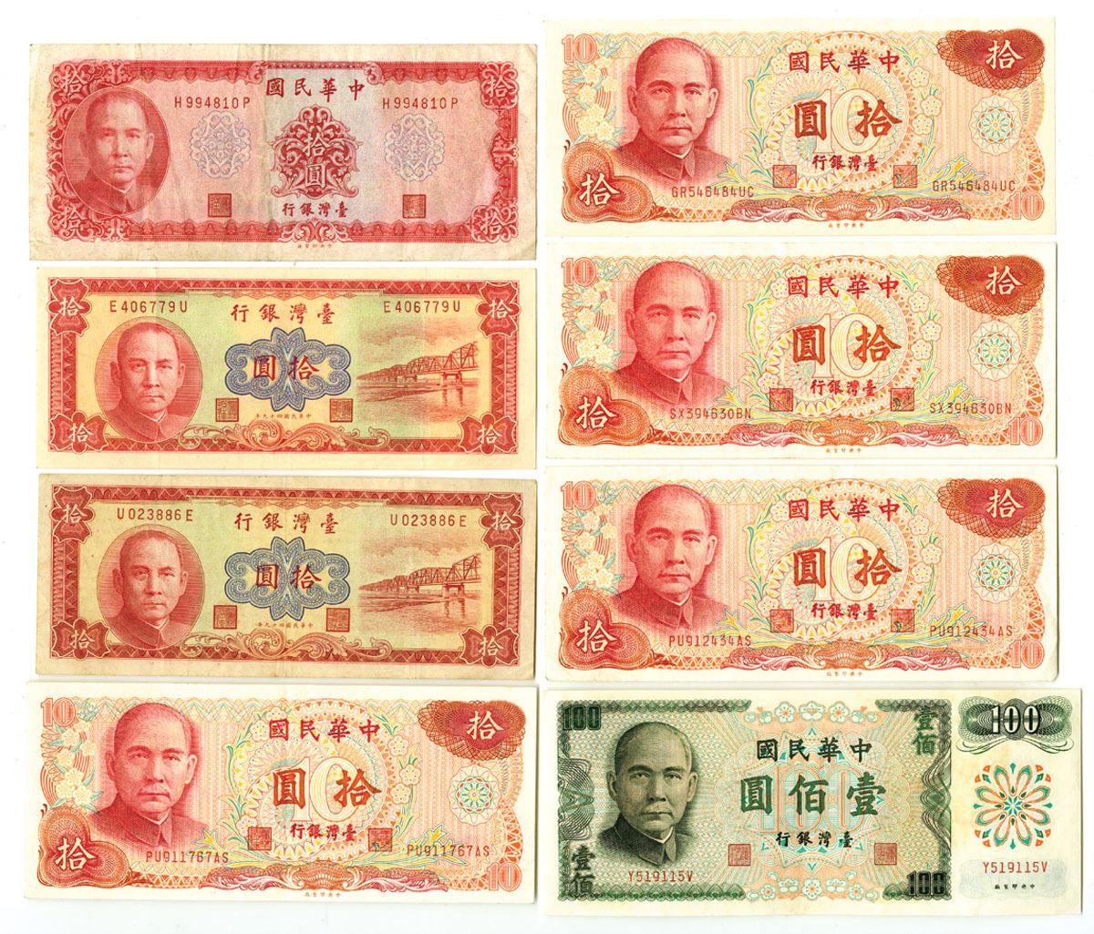 China - Taiwan...., 1960-76. Lot of 8 Issued Banknotes, Includes: 1960, 10 Yuan, P-1970 (2) S/M#T73-51, PFBT (no imprint); 1972, 100 Yuan, P-1973a, CPF; 1969, 10 Yuan, P-1979a, CPF; 1976, 10 Yuan, P-1984 (4), CPF. Notes range from VF to Unc condition. (8). Sold "AS IS" no returns accepted.