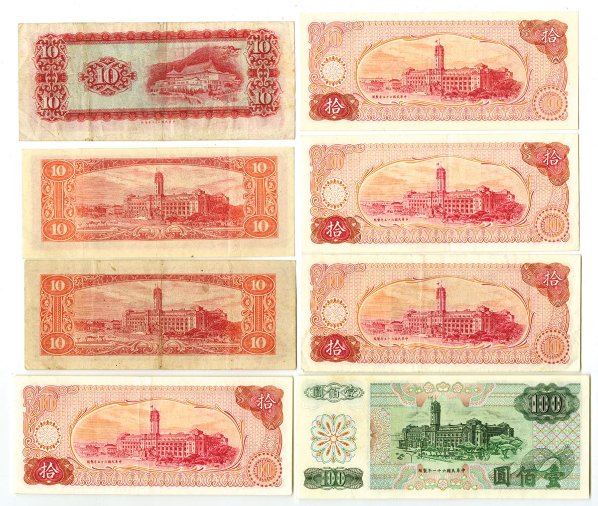 China - Taiwan...., 1960-76. Lot of 8 Issued Banknotes, Includes: 1960, 10 Yuan, P-1970 (2) S/M#T73-51, PFBT (no imprint); 1972, 100 Yuan, P-1973a, CPF; 1969, 10 Yuan, P-1979a, CPF; 1976, 10 Yuan, P-1984 (4), CPF. Notes range from VF to Unc condition. (8). Sold "AS IS" no returns accepted.