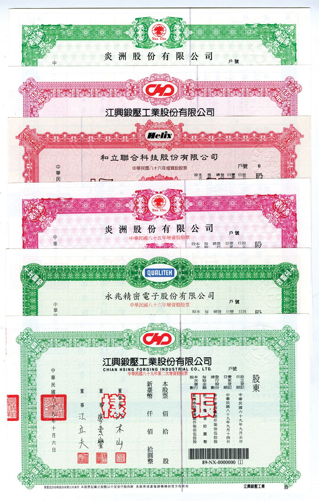 Taiwan, China. ND (1980s). Lot of 6 Taiwan, Chinese Stock Certificates printed in Chinese and some English. Includes: Chian Hsing Forging Industrial Co., Ltd (2 examples, one with red border, the second with a green border); Qualitek (Yongzhao Precision Electronics Co., Ltd.) ; Yen Cho (Yanzhou Co., Ltd., 2 examples, one with red border, the second with a green border); Helix; . All with Chinese Specimen overprints, all in Uncirculated condition. (6). Sold "AS IS" no returns accepted.