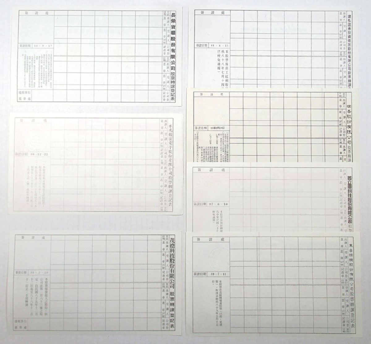 Taiwan, 2000-2007. Lot of 7 Specimen Stock & Bond Certificates printed in Taiwanese, Certificates have bright colored borders and underprint with Specimen overprints (Printed in Chinese)), Includes Evergreen Container Company; Yongzhao Precision Electronics Co. - Qualitek; Maode Technology Company - ProMos Technologies; National Investment Trust Limited; Shifeng Co. - Uretek; Premier Technology Co.; and, Donghe Precision Machinery Co. - Tongtai. All are in Uncirculated Condition. (7). Sold "AS IS" no returns accepted.