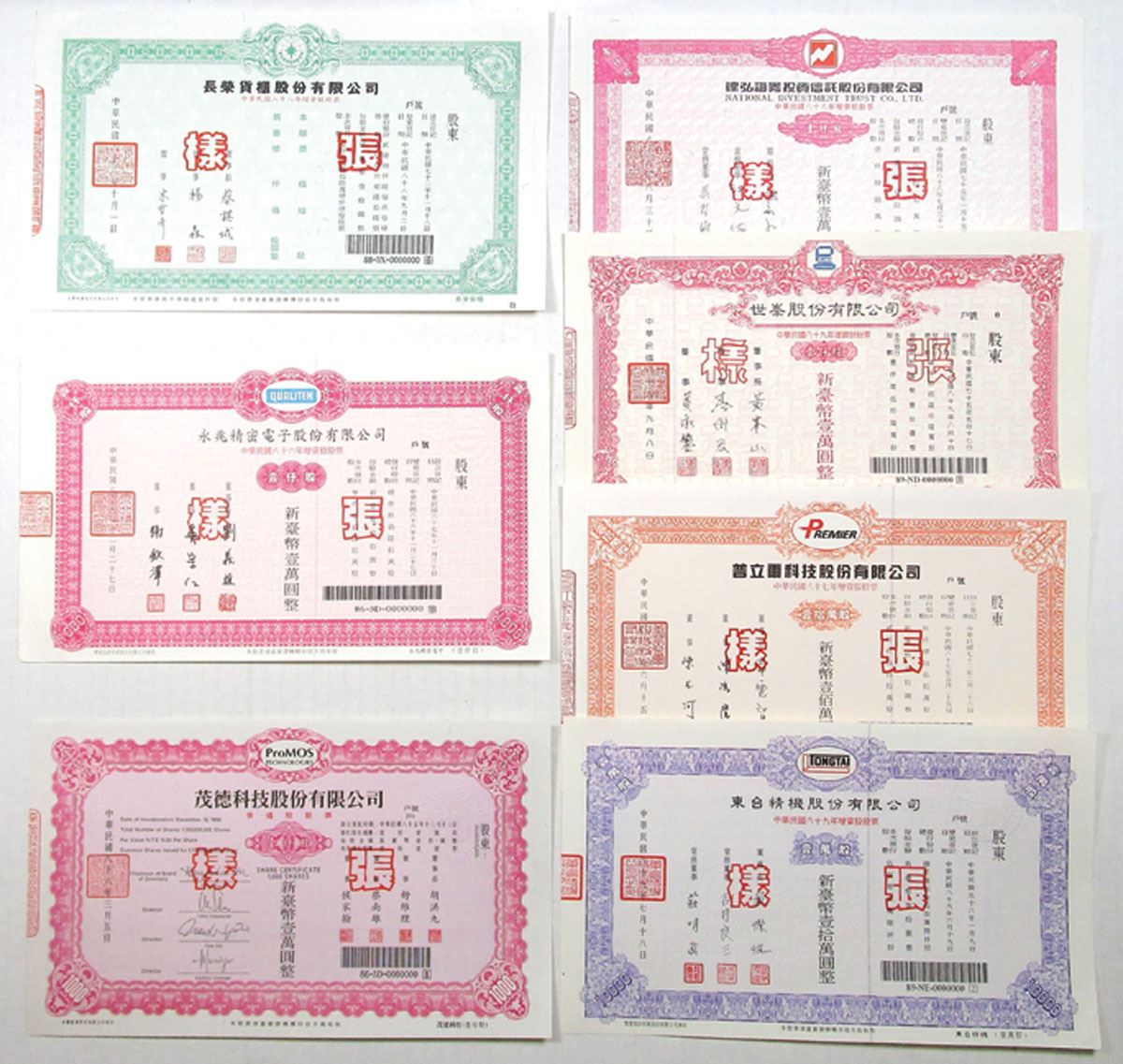 Taiwan, 2000-2007. Lot of 7 Specimen Stock & Bond Certificates printed in Taiwanese, Certificates have bright colored borders and underprint with Specimen overprints (Printed in Chinese)), Includes Evergreen Container Company; Yongzhao Precision Electronics Co. - Qualitek; Maode Technology Company - ProMos Technologies; National Investment Trust Limited; Shifeng Co. - Uretek; Premier Technology Co.; and, Donghe Precision Machinery Co. - Tongtai. All are in Uncirculated Condition. (7). Sold "AS IS" no returns accepted.