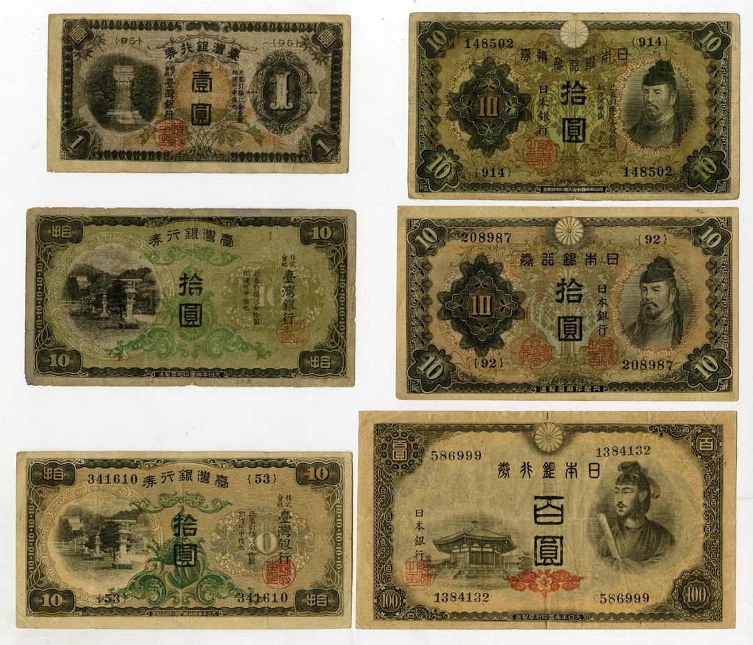 China - Taiwan, ND (1930) - ND (1944). Lot of 6 Issued Banknotes, Includes: Bank of Taiwan Ltd. 1 Yen, P-1925b, S/M#T70-40, 1944; 10 Yen, P-1927a, S/M#T70-32, 1932; 10 Yen, P-1930b, S/M#T70-43, 1945; Bank of Japan 10 Yen, P-40a, 1930, 100 Yen, P-42a, 1930; Great Imperial Japanese Government 10 Yen, P-51a, 1943. Notes range from VF-XF condition. (6). Sold "AS IS" no returns accepted.