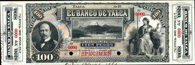18-- (ca.1885). P-S443s. 100 Pesos Specimen. Red specimen overprint, POC and "00000" serial numbers. Counterfoils on left and right side of note. Mounting remnants on top margin of back of note. Archival ink graffiti on lower margin and left margin, otherwise note appears crisp Unc. to Choice Unc. Rare note. Unpriced in Pick. ABNC.