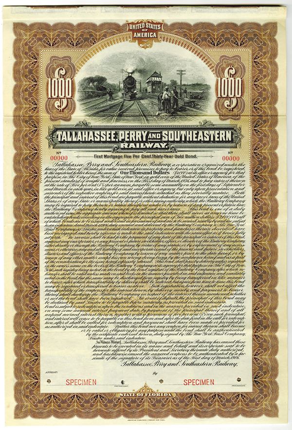 Florida, 1906. $1000 Specimen 5% First Mortgage Gold Coupon Bond, Black text with brown border and undertint, Train approaching head on with men working on either side at top center. Red specimen overprints, 00000 serial numbers, POCs. VF condition, ABNC. Known as a bond but not previously seen in Cox. Only found as a specimen with only 2 examples known.
